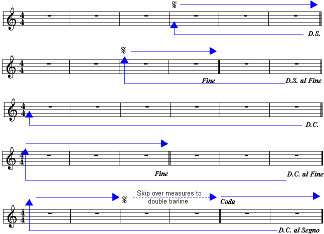 - D.S. al Fine hoặc D.C. al Coda là những dạng phổ biến trong biểu diễn nhạc cổ điển, nhạc nhà thờ và cả nhạc jazz.