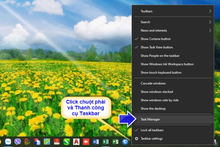– Bạn Click chuột phải tại thanh Taskbar > và chọn Task Manager như hình H.2