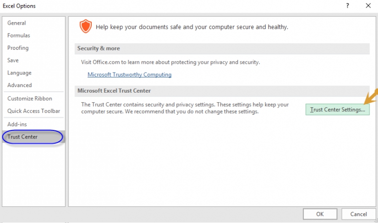 Bước 3: Kiểm tra và chỉnh các tùy chọn trong Excel Options của Excel cho phù hợp.- Mở Excel > Tại tab File > Chọn Options > Xuất hiện hộp thoại Excel Options > Tiếp tục vào Trust Center > Chọn Trust Center Settings như hình (H.8)