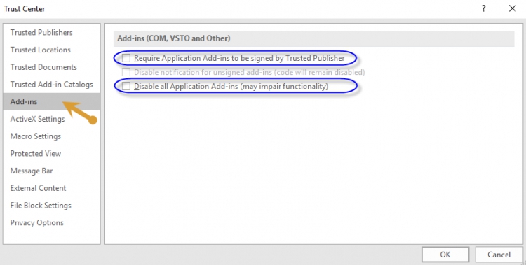 – Trong hộp thoại hiện ra, bạn chọn mục Add-ins, bạn bỏ dấu tích trong 2 mục “Require Application Add-ins to be signed by Trusted Publisher” và “Disable all Application Add-ins(may impair Functionality)”. như hình (H.9) > Sau đó chọn OK