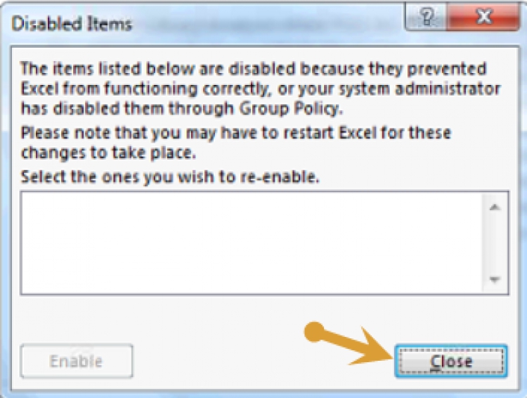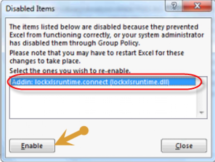 – Tại hộp thoại Disabled Items > Kiểm tra có dòng Add-ins: lockxlsruntime không, nếu có > chọn “Add-ins: lockxlsruntime” > và nhấm Enable như hình (H.11) > Chọn Close để hoàn tất như hình (H.12), nếu không có lockxlsruntime thì chọn Close để thực hiện bước tiếp theo