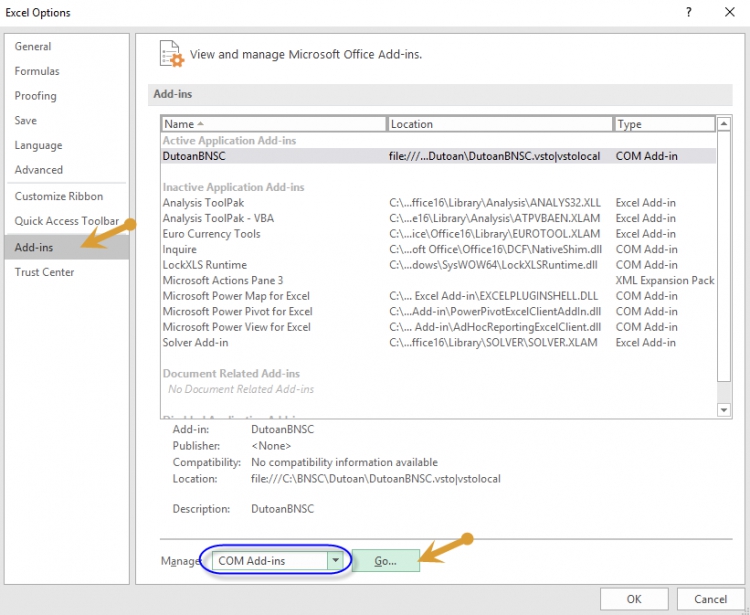 – Tiếp tục tại hộp thoại Excel Options > Vào Menu Add-ins > Tại mục mục “Manage“, các bạn chọn phần COM Add-ins > Bấm Go như hình (H.13) > Xuất hiện hộp thoại COM Add-ins như hình (H.14)