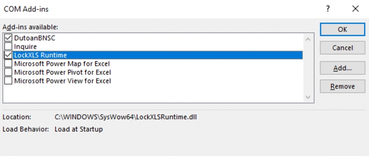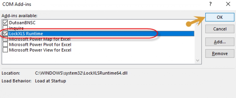 Bước 5: Kích hoạt Add-ins LockXLS Runtime trong COM Add-ins.