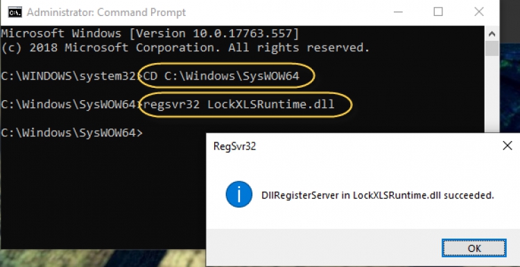 – Tại hộp thoại Administrator: Command Prompt bạn đăng ký LockXLS Runtime như sau: