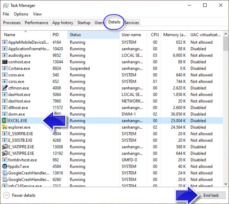 – Tại hộp thoại Task Manager hiện ra > Bạn chọn Menu Details > Tìm và chọn EXCEL.EXE (nhấn phím E để tìm nhanh) trong danh mục ở dưới > chọn End task để thoát excel đang chạy như hình H.4