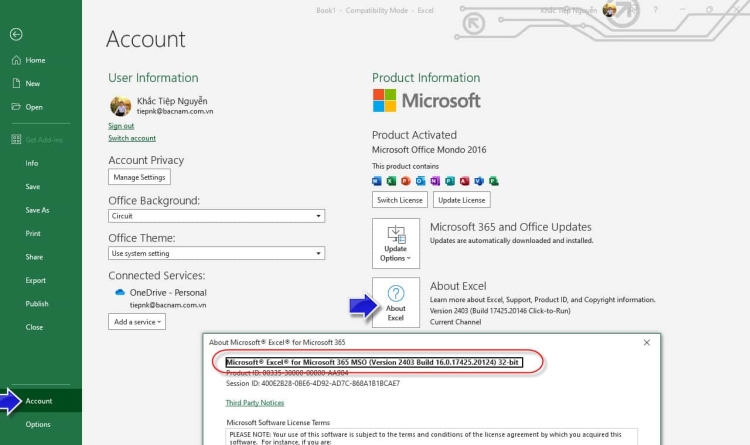 – Tải chương trình LockXLS Runtime về máy. Lưu ý khi trước khi tải phải kiểm tra Microsoft Office trên máy của bản là bản 64bit hay 32bit [Tại giao diện chính của Excel > Vào Menu File > Account > About Excel > Xem thông tin tại Hộp thoại hiện ra như hình H.3] để tải đúng bản LockXLS Runtime tương ứng (Excel 64 bit thì tải LockXLS 64 bit, Excel 32bit thì tải bản LockXLS 32bit) như hình (H.4)