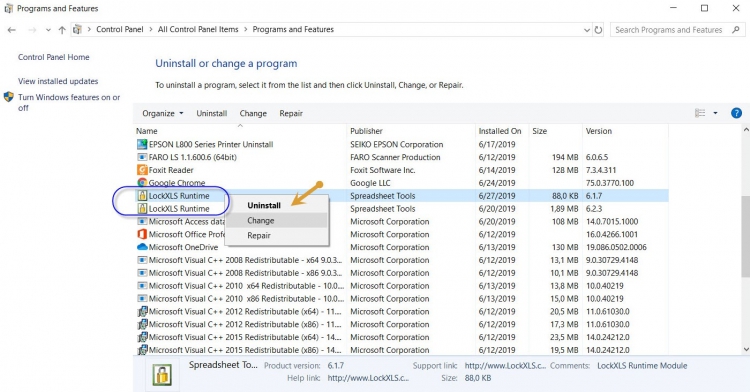 Lưu ý: Trước khi tiến hành cài đặt LockXLS Runtime, bạn thoát Excel và gỡ bỏ bản LockXLS củ trên máy (nếu có) > Vào Control Panel All Control Panel Items Programs and Features > Click chuột phải vào các LockXLS Runtime chọn Uninstall để gỡ ra như hình (H.5a)