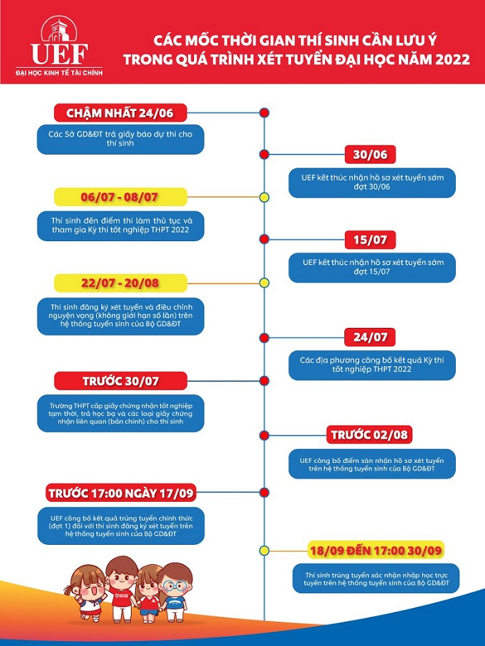 Chúc các sĩ tử sẽ hoàn thành kỳ thi một cách thuận lợi và đạt được kết quả như mong đợi. Để giảm tải áp lực tâm lý bởi kỳ thi này, các bạn có thể cân nhắc đăng ký xét tuyển sớm bằng các phương thức khác tại các trường. Bên cạnh xét tuyển bằng kết quả kỳ thi tốt nghiệp THPT, nhằm giúp các bạn thí sinh tăng thêm cơ hội trúng tuyển đại học, UEF hiện đang nhận hồ sơ tuyển sinh của phương thức xét tuyển học bạ theo tổng điểm trung bình 3 học kỳ hoặc xét tuyển học bạ lớp 12 theo tổ hợp 3 môn đến ngày 15/7. Hồ sơ đăng ký xét tuyển học bạ THPT tại UEF – Đơn xét tuyển học bạ – Bản photo công chứng học bạ THPT. – Bản photo công chứng bằng tốt nghiệp THPT hoặc giấy chứng nhận tốt nghiệp THPT tạm thời. – Giấy chứng nhận ưu tiên (nếu có). Thí sinh có thể nộp hồ sơ trực tiếp tại trường hoặc gửi bưu điện theo theo địa chỉ: Trung tâm Tư vấn tuyển sinh, Trường Đại học Kinh tế – Tài chính TP.HCM (UEF) 141 – 145 Điện Biên Phủ, Phường 15, Quận Bình Thạnh, TP.HCM Điện thoại: (028) 5422 5555 Hotline: 094 998 1717 – 091 648 1080 Zalo OA: UEF University – uef.edu.vn/zalo