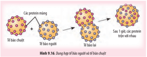 2. David Frye và Micheal Edidin tại trường Đại học tổng hợp Johns Hopkins đã đánh dấu protein màng của tế bào người và tế bào chuột bằng hai loại dấu khác nhau và dung hợp các tế bào lại. Họ dùng kính hiển vi để quan sát các dấu ở tế bào lai, kết quả quan sát như hình
