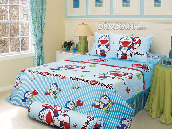 Điểm độc đáo của chăn ga gối Sông Hồng Doremon D15011 đến từ sự kết hợp giữa Doraemon và kẹo ngọt. Nền vải xanh dương điểm thêm họa tiết đỏ tạo cảm quan rộn ràng, thú vị song không quá bức bối. Còn điều gì tuyệt vời hơn lời chúc ngọt ngào này trước mỗi giấc ngủ của bé.