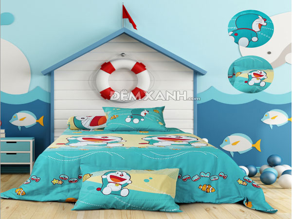 Sắc xanh dương của bộ chăn ga gối Sông Hồng Doremon D17018 có khả năng làm dịu hiệu quả. Cảm giác an tầm xoa dịu tất cả mệt mỏi của bé sau một ngày học tập, vui chơi hết mình. Thêm vào đó, bức tranh biển cả với làn sóng, những chú cá nhỏ cũng là chìa khóa để khả năng sáng tạo cho bé ngay từ những năm đầu đời.