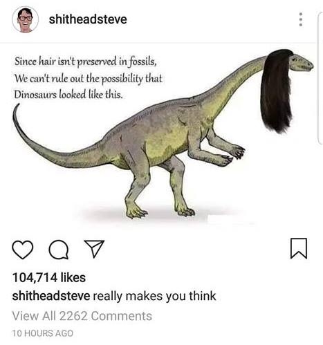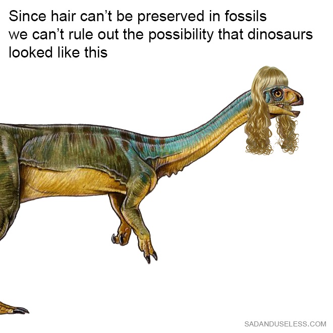 I was awake late at night, learning about dinosaurs on Wikipedia (because I’m cool like that), and I saw a quite funny picture of a dinosaur called Lufengosaurus, looking all shifty. I thought it would be funny to add some hair to it in Photoshop. I sent the image to a couple of friends, then went to bed and forgot about the whole thing. I also made an even more bizarre version, mainly just trying to be a surreal as possible: