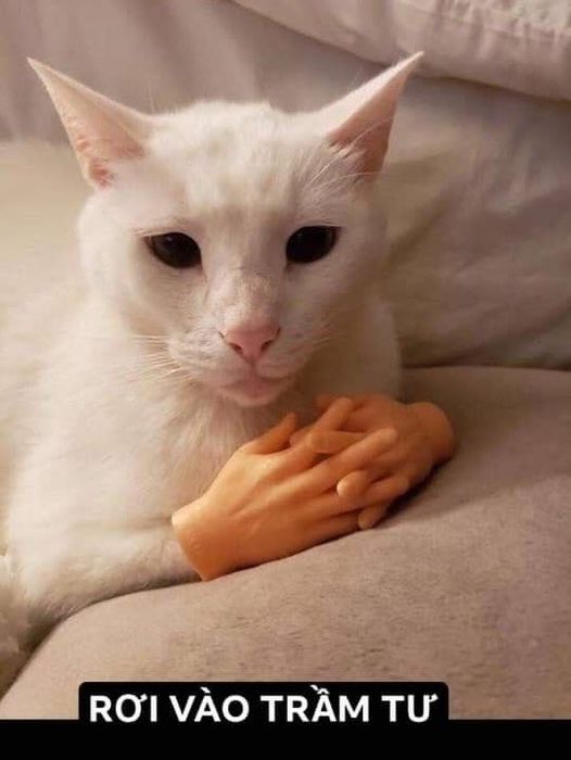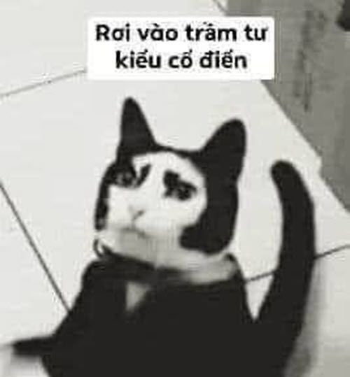 Meme mèo với biểu cảm suy tư đầy chiêm nghiệm