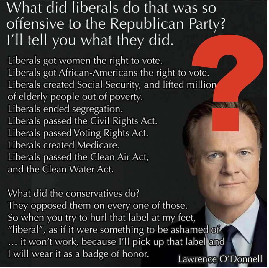 Before I deconstruct the list, it is worth noting that the person whom the meme content is attributed to is Lawrence O’Donnell, who has a show on MSNBC and acted in the TV series, The West Wing, a show that many self-identifying liberal (especially white liberals) celebrated. For me it is instructive that the Liberal vs Conservative binary being used here comes from a white liberal who not only has celebrity status, but class privilege. Arguably, these traits – white, with economic privilege and someone who enjoys celebrity status – are how many people see liberals. For an interesting critique of how working class people see liberals, read the book, Deer Hunting with Jesus: Dispatches from America’s Class War, by Joe Bageant.