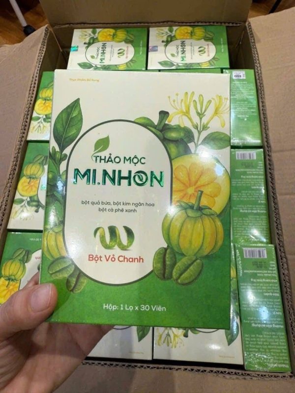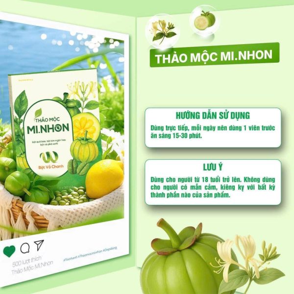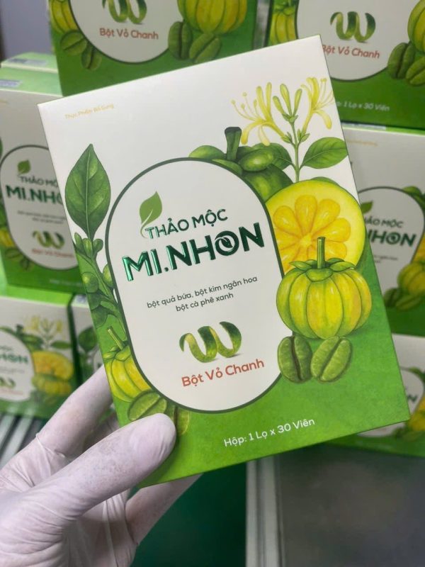 Thảo mộc Mi Nhon được chiết xuất từ thiên nhiên, hiệu quả cho người sử dụng với các thành phần: Bột quả bứa, bột kim ngân hoa, bột gạo lứt, bột vỏ chanh, bột cafe xanh