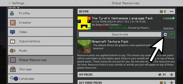 - 4. Open Minecraft > Settings > Go to Global Resources > Choose Vietnamese Pack and Activate it.