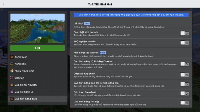 Ore UI Create New World/Beta Features screen (it’s impossible to fix font bugs using resource packs)