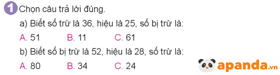 b) Biết số bị trừ là 52, hiệu là 28, số trừ là 52 – 28 = 24