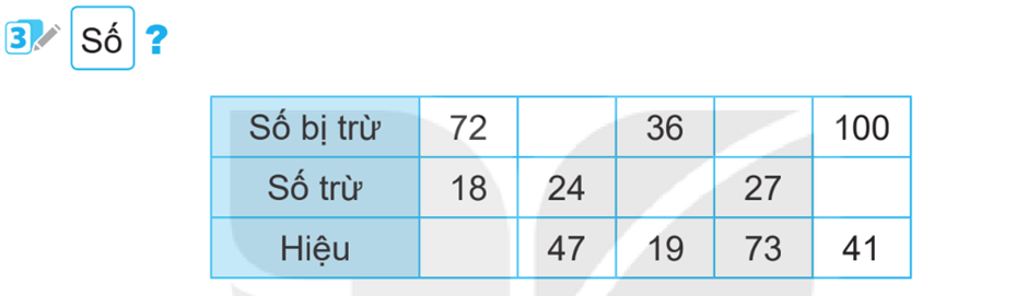 Số bị trừ 33 51 36 54 82 164 2340 Số trừ 7 8 27 32 50 64 40 Hiệu 26 43 9 22 32 100 2300