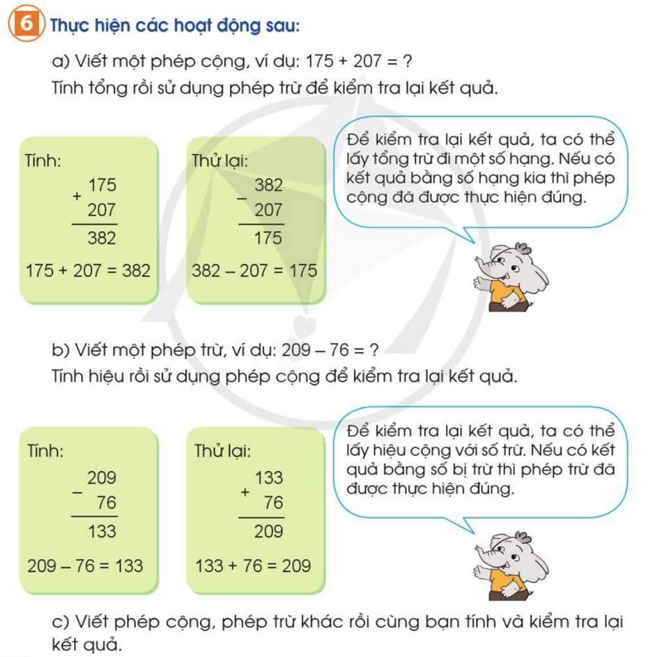 c) Chọn một phép cộng, phép bất kì rồi tính tổng. Sau đó, sử dụng phép trừ, phép cộng để kiểm tra lại kết quả.
