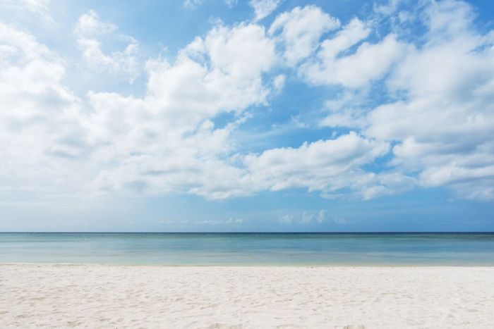 Background bầu trời xanh kết hợp với cát trắng tinh khôi, tạo nên khung cảnh biển đầy mộng mơ và thanh bình.