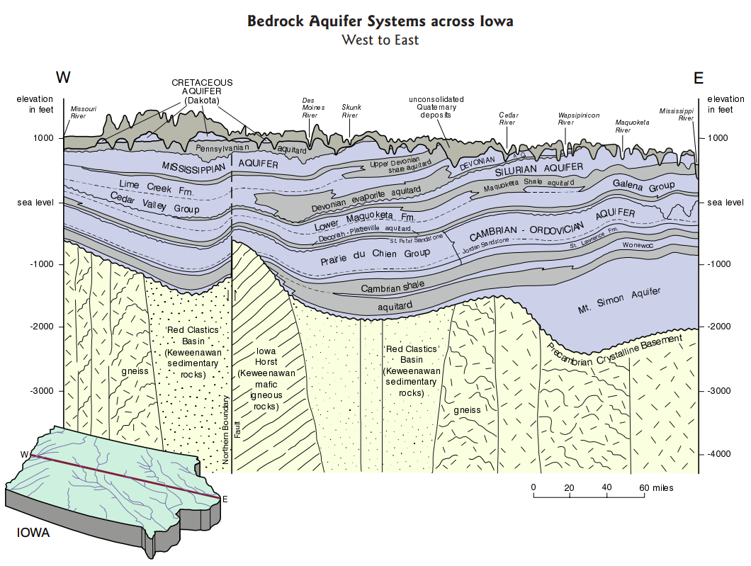 Tất cả người dân Iowa có giếng nước riêng nên kiểm tra nitrat hàng năm, vì nitrat trong nước ngầm nông có thể thay đổi theo từng năm và theo mùa tùy theo hệ thống. Các giếng nước nông có độ sâu dưới 100 feet và các giếng ở vùng karst dễ bị nitrat nhất. Karst là một dạng đá có cấu trúc tương tự như pho mát Thụy Sĩ và thường thấy ở đông bắc Iowa. Các loại đá được tạo thành từ các vật liệu như đá vôi dễ hòa tan tạo thành các lỗ. Khi trời mưa, nước từ bề mặt dễ dàng xâm nhập vào các tầng chứa nước ngầm.