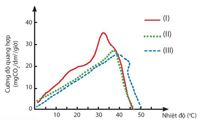 Đồ thị thể hiện ảnh hưởng của nhiệt độ đến quang hợp ở cây khoai tây (I), cây cà chua (II) và cây dưa chuột (III)