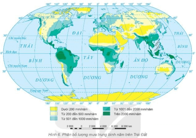 – Lượng mưa trên Trái Đất phân bố không đều, giảm dần từ xích đạo về hai cực.