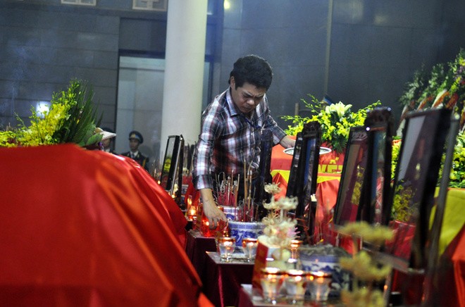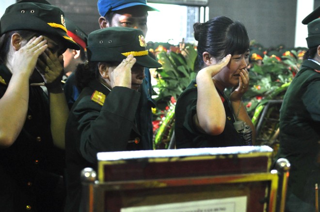 Đại tướng Phùng Quang Thanh, Bộ trưởng Bộ Quốc phòng đau buồn trước sự hy sinh các chiến sĩ của mình. Dẫn đầu đại diện cho quân đội, ông im lặng làm theo sự hướng dẫn. Trước sự hy sinh này, Tướng Thanh trong sổ tưởng niệm thay mặt Bộ Quốc phòng khăng định sẽ chăm lo tốt nhất về các chế độ, chính sách với người thân, gia đình các liệt sĩ.. Ảnh: Nguyễn Dân