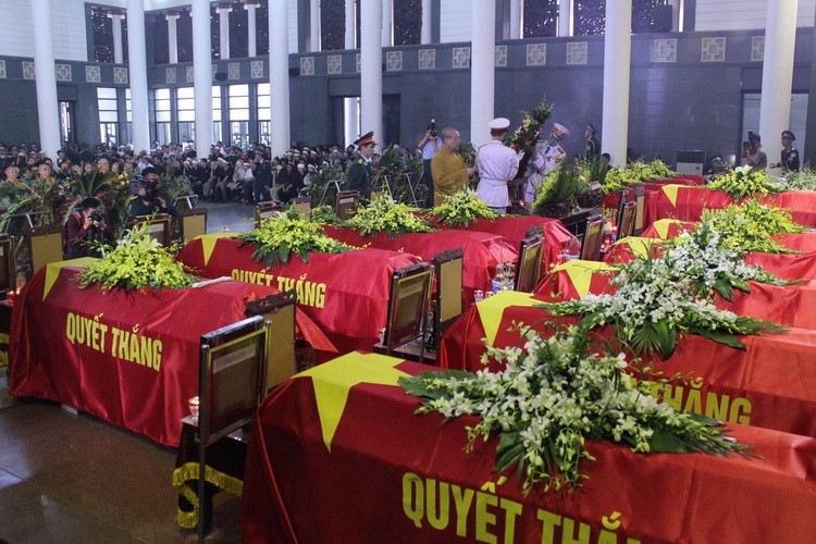 Linh cữu 18 chiến sỹ hy sinh trong lễ viếng và truy điệu. Ảnh: Nguyễn Dân