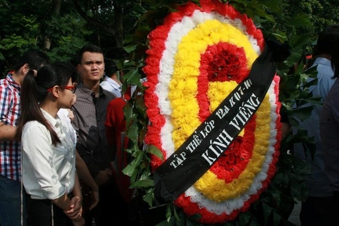 Trong số người thân của 18 cán bộ, chiến sỹ có tập thể lớp 12A, khóa 2007 – 2010 là bạn học cùng của chiến sỹ Đỗ Văn Minh hy sinh trong khi huấn luyện đã mang vòng hoa đến viếng. Anh Vũ Văn Công, 22 tuổi, bạn của chiến sỹ Đỗ Văn Minh ngậm ngùi: “Sau khi nhận được tin Minh hy sinh, em cũng như các bạn tập thể lớp 12A trường THPT Tống Duy Tân, Vĩnh Lộc, Thanh Hóa đã rất đau buồn, hôm nay cả lớp em hơn 30 bạn học cùng Minh đã đến viếng, chia buồn cùng với gia đình bạn Minh. Sáng mai, em sẽ cùng các bạn đưa linh cữu của bạn Minh về an táng tại nghĩa trang liệt sỹ huyện Vĩnh Lộc”, anh Công nghẹn lời. (Ảnh: Các bạn cùng lớp của chiến sỹ Đỗ Văn Minh đem vòng hoa đến viếng bạn-Theo infonet).