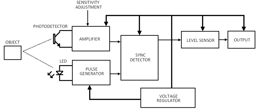 Cảm biến liên tục theo dõi sự phản xạ của ánh sáng phát ra từ chính nó. Khi một vật thể cản trở chùm tia phản xạ, cảm biến sẽ phát hiện ra rằng vật thể đó đang tồn tại.