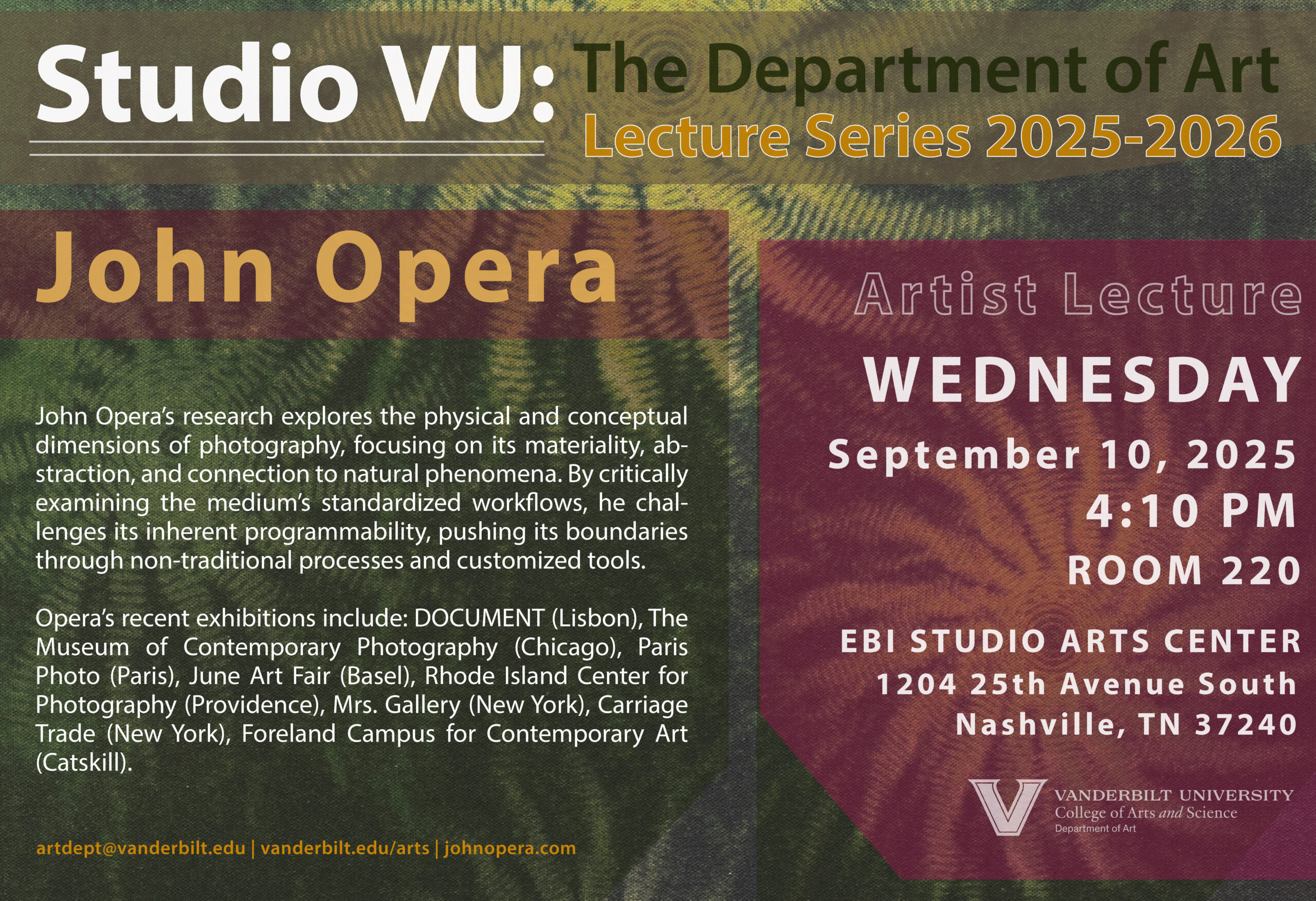 Studio VU Lecture with Visiting Artist John Opera Date: Wednesday, September 10, 2025 Time: 4:10pm Venue: Room 220, E. Bronson Ingram Studio Arts Center (EBI Studio Arts) 1204 25th Avenue South, Nashville, TN 37240 Website: as.vanderbilt.edu/art; johnopera.com Instagram: @vanderbilt.art