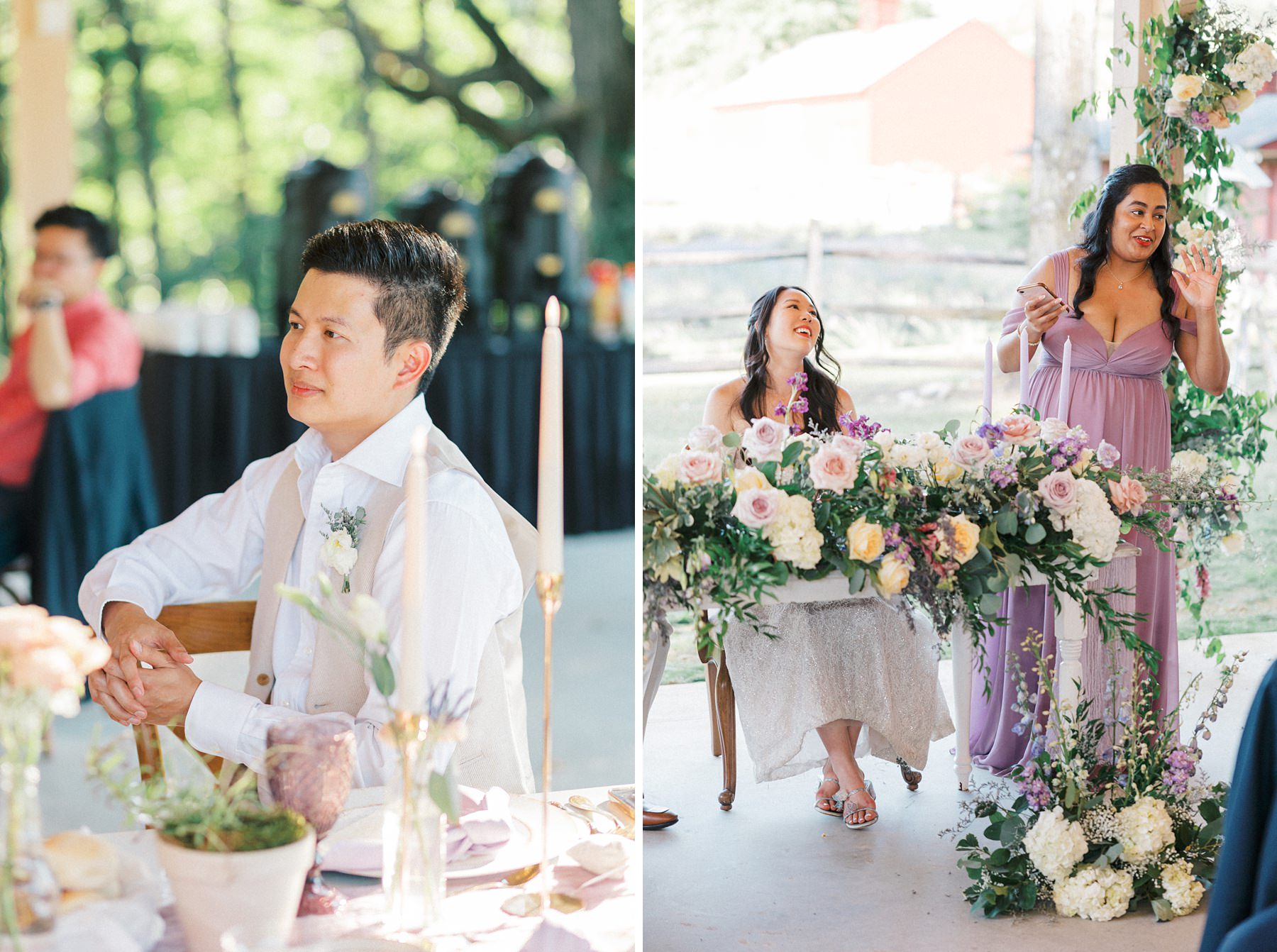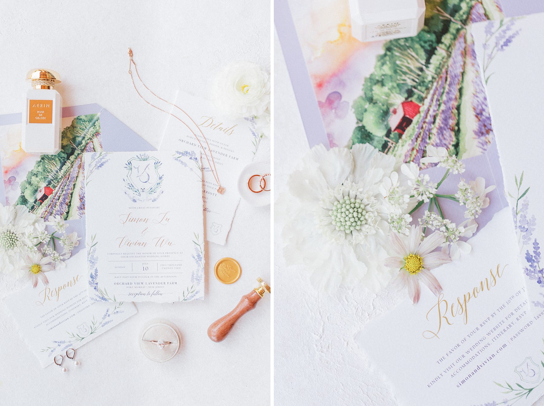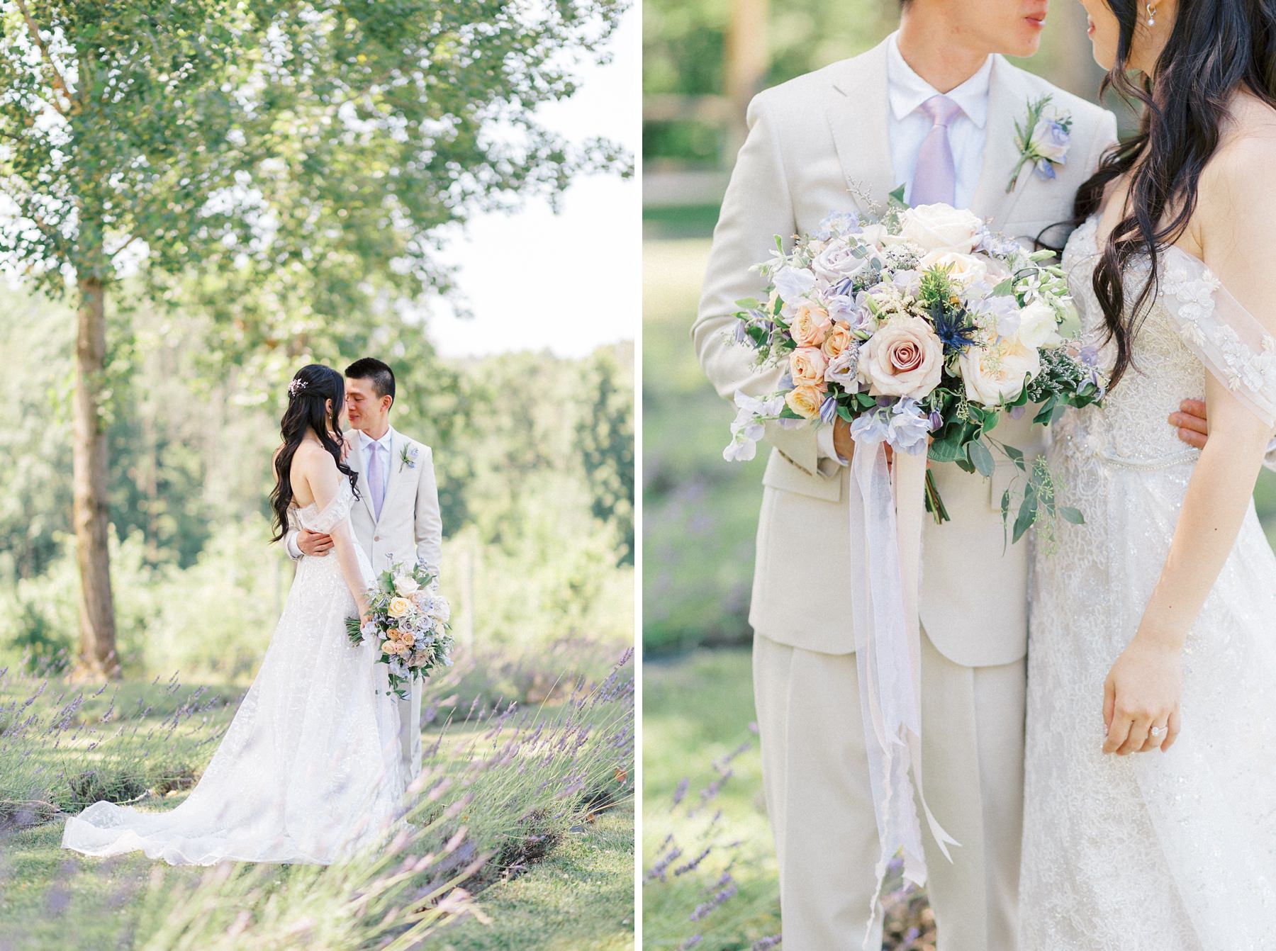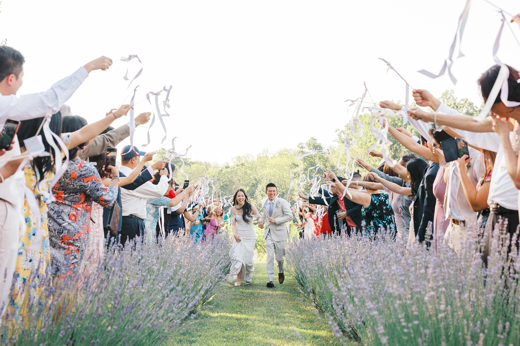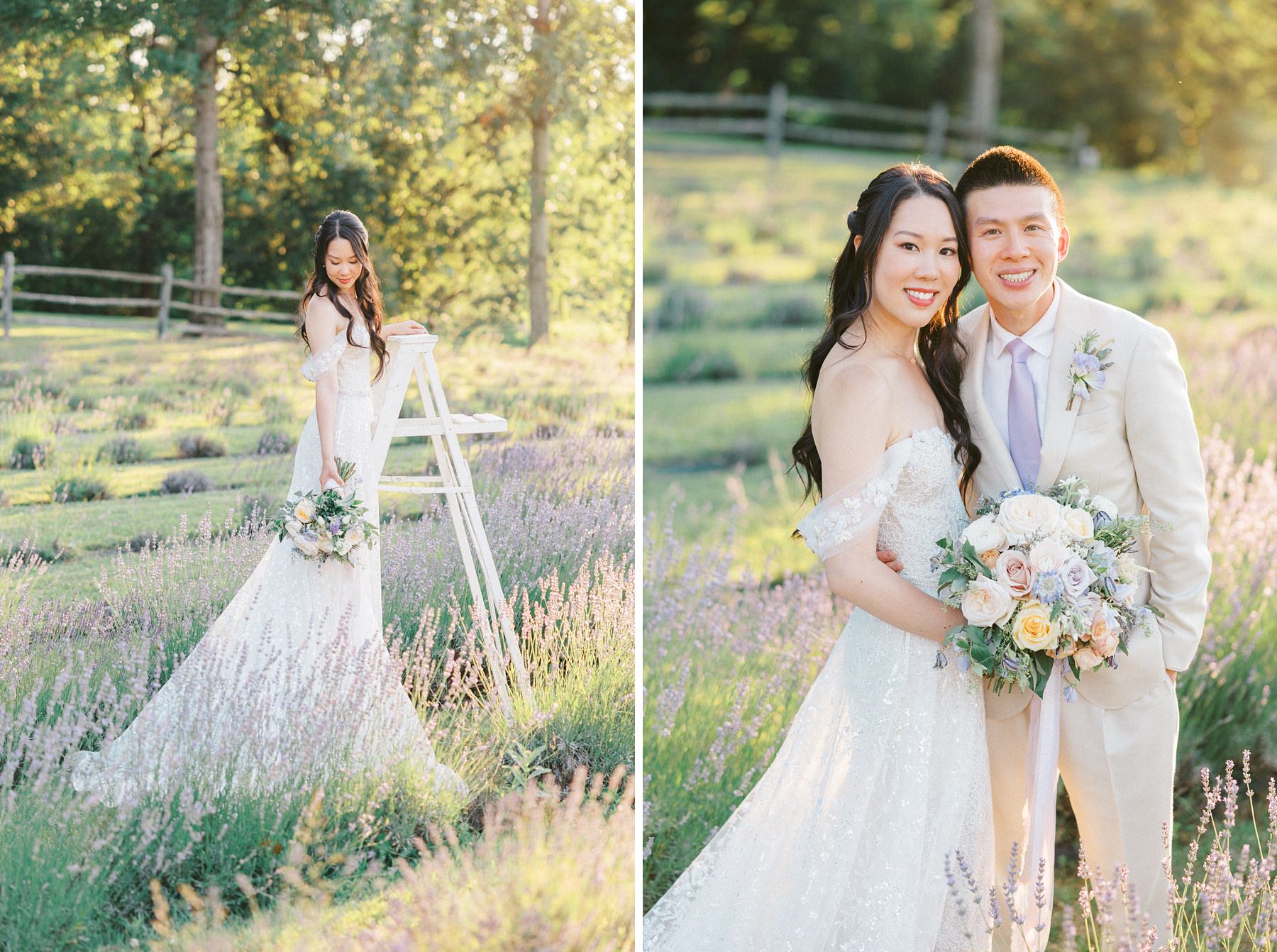 “Our vision for the wedding was inspired by European/French Provence lavender mixed with Bridgerton vibes (antique pieces and decor, lots of floral and leafy touches, lawn games, macarons) to enhance the beauty and magic of the lavender farm. We wanted to stay true to ourselves for our wedding and really make it our own. We knew we couldn’t have a wedding without some of our favorites things: sushi, bubble tea, abundance of desserts (cake, macarons, ice cream), and lots of photo ops throughout the property.”