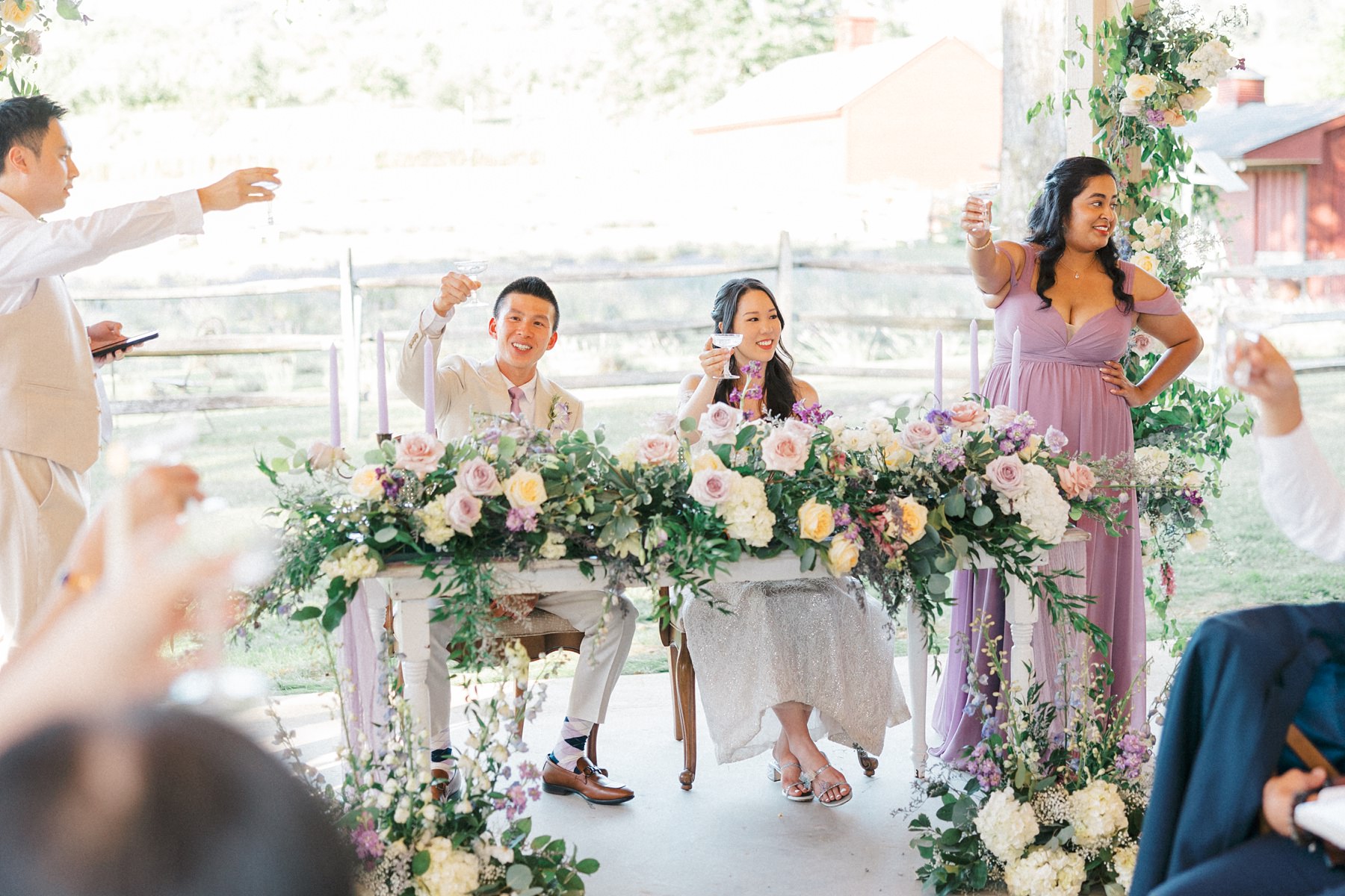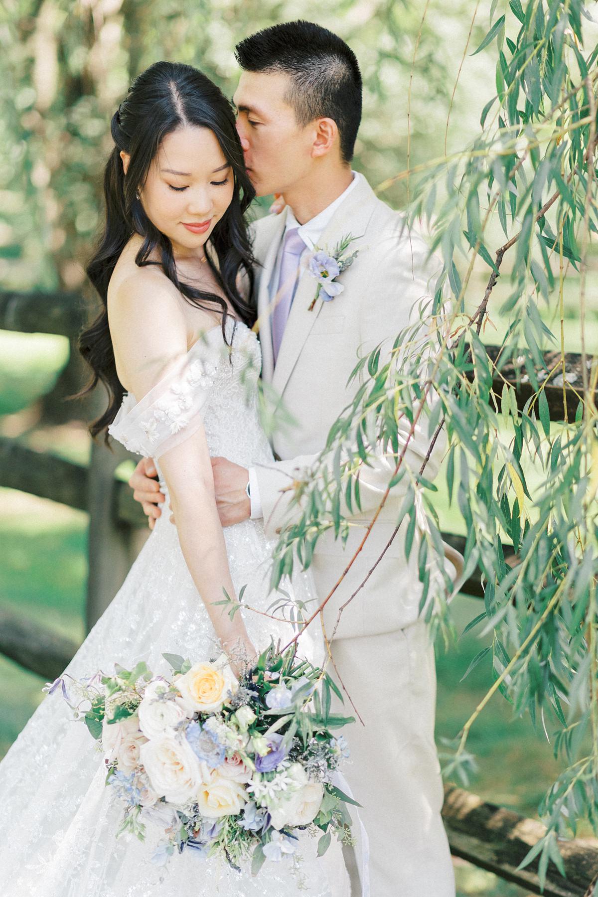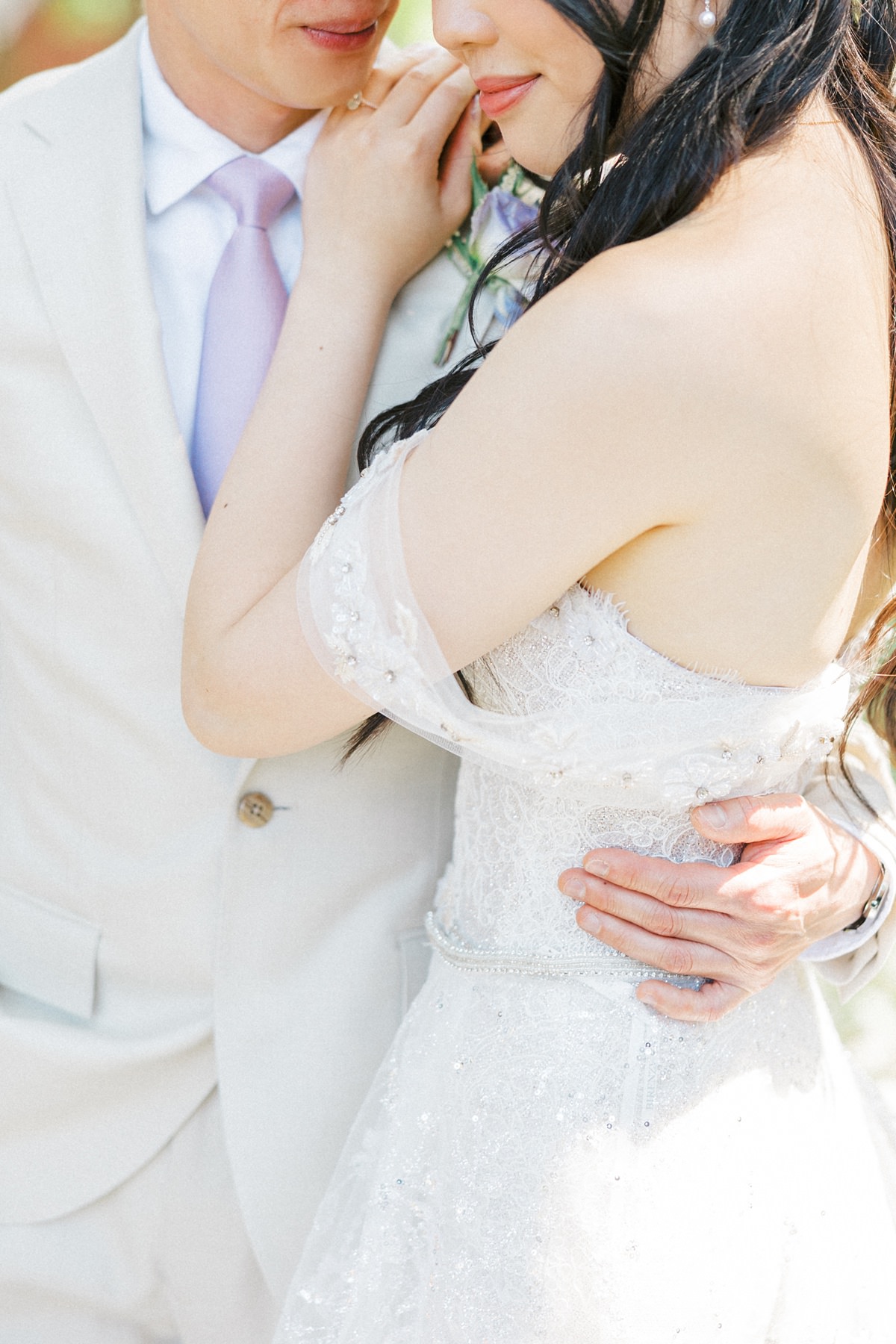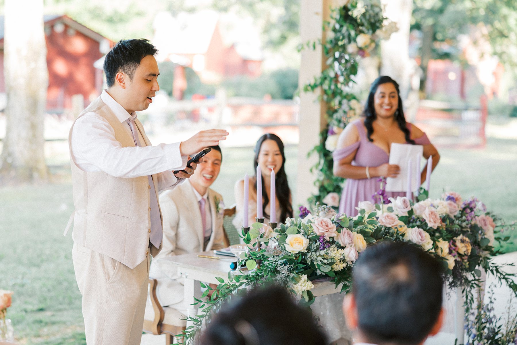 “Our vision for the wedding was inspired by European/French Provence lavender mixed with Bridgerton vibes (antique pieces and decor, lots of floral and leafy touches, lawn games, macarons) to enhance the beauty and magic of the lavender farm. We wanted to stay true to ourselves for our wedding and really make it our own. We knew we couldn’t have a wedding without some of our favorites things: sushi, bubble tea, abundance of desserts (cake, macarons, ice cream), and lots of photo ops throughout the property.”