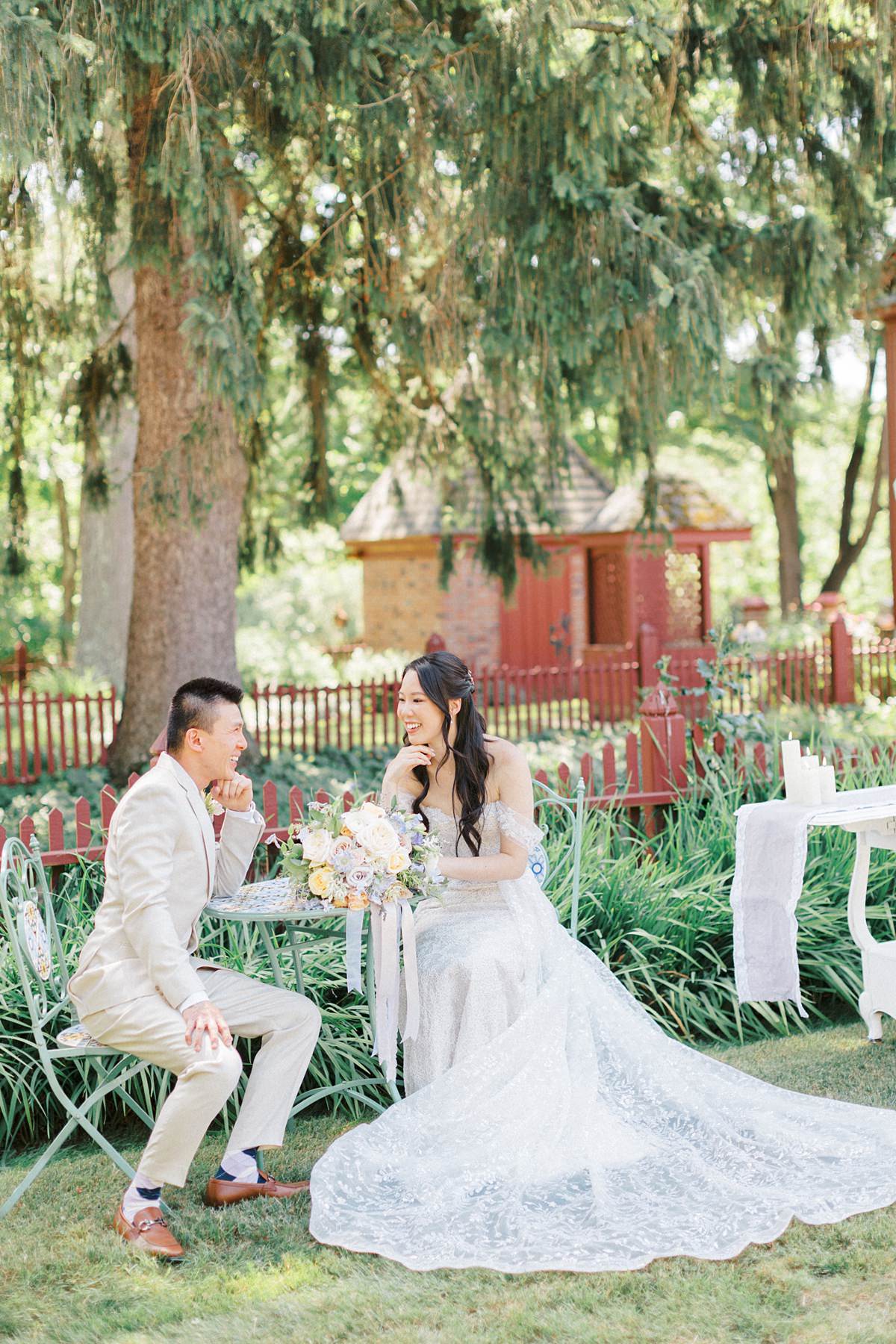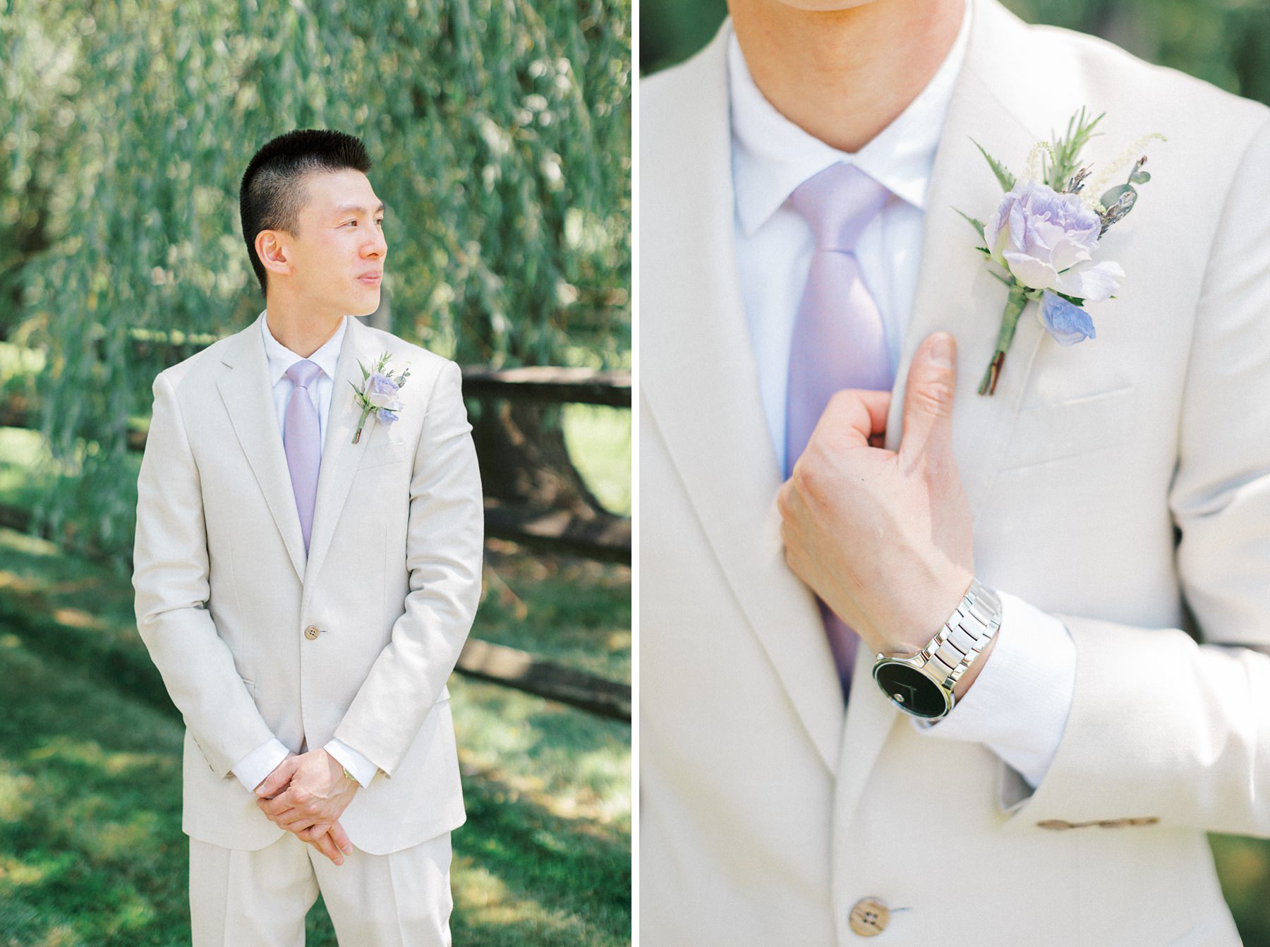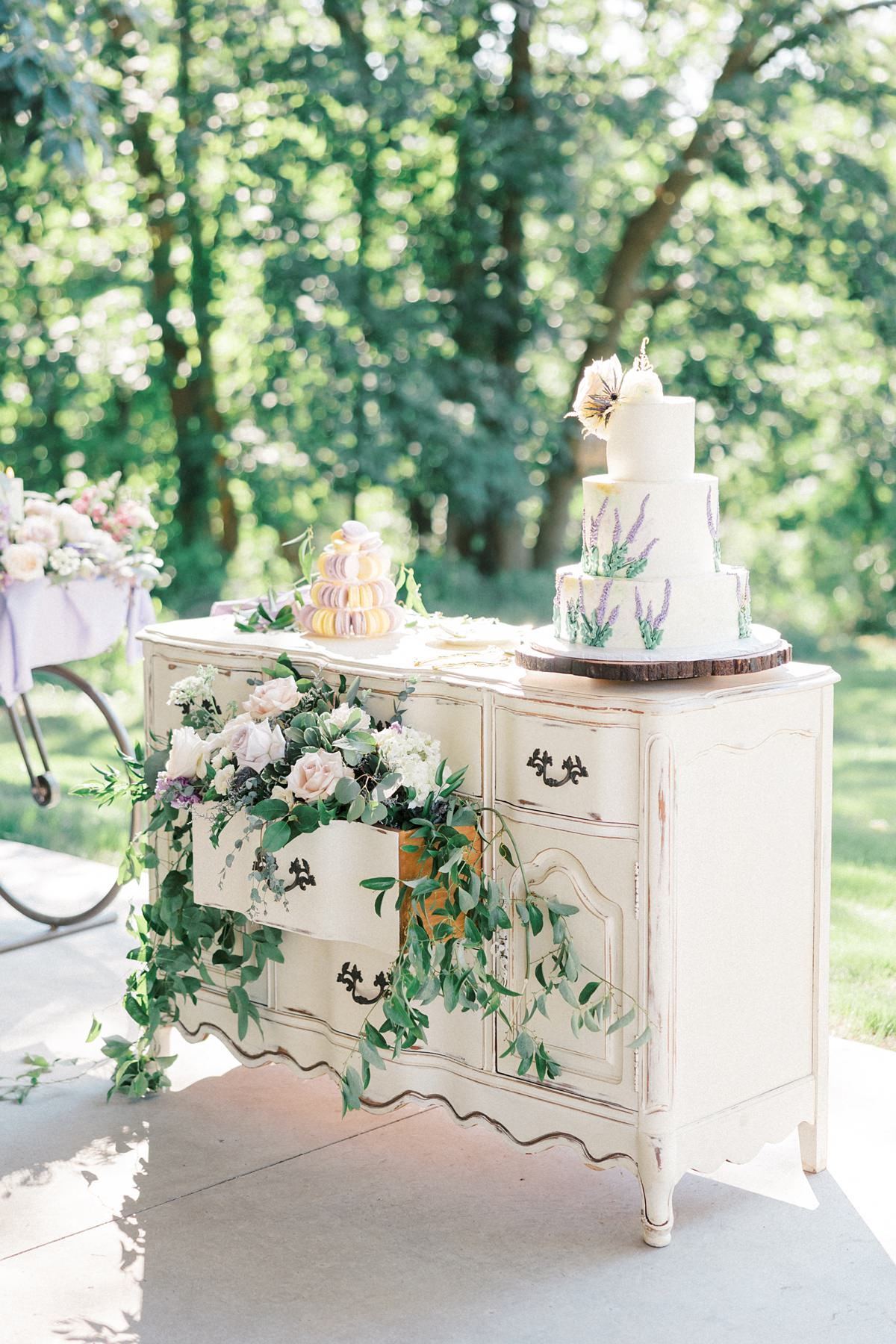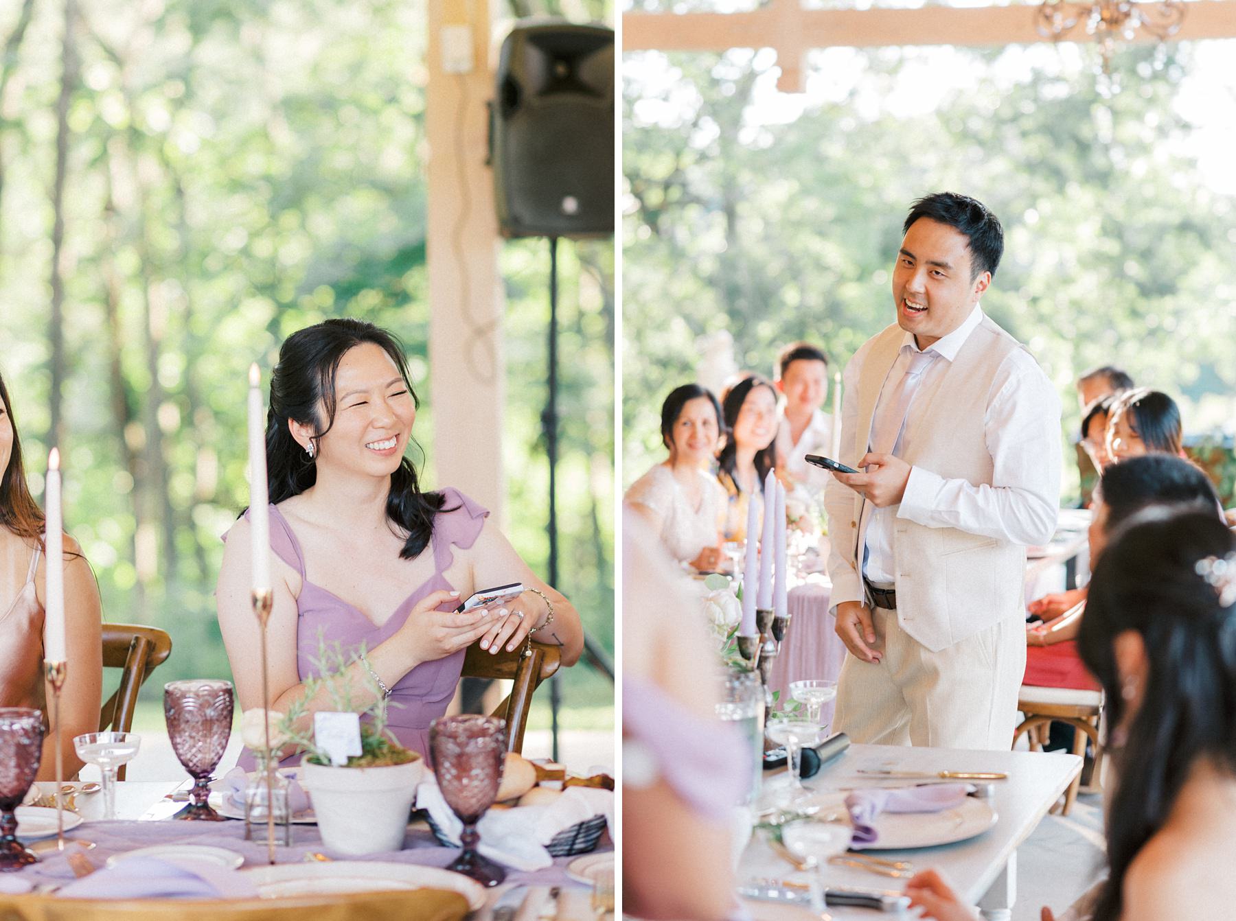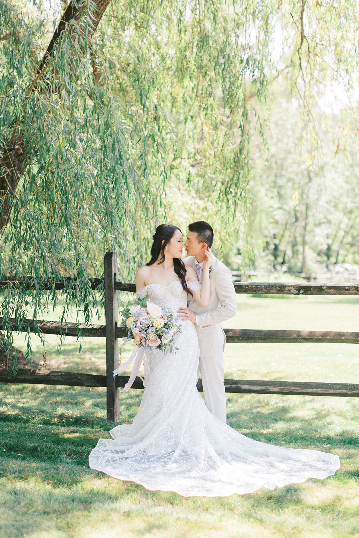 “Our vision for the wedding was inspired by European/French Provence lavender mixed with Bridgerton vibes (antique pieces and decor, lots of floral and leafy touches, lawn games, macarons) to enhance the beauty and magic of the lavender farm. We wanted to stay true to ourselves for our wedding and really make it our own. We knew we couldn’t have a wedding without some of our favorites things: sushi, bubble tea, abundance of desserts (cake, macarons, ice cream), and lots of photo ops throughout the property.”