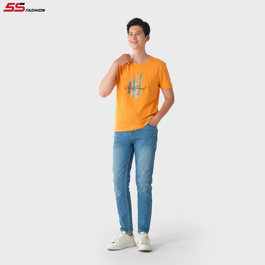 Áo thun nam màu vàng kết hợp quần jeans và giày thể thao năng động