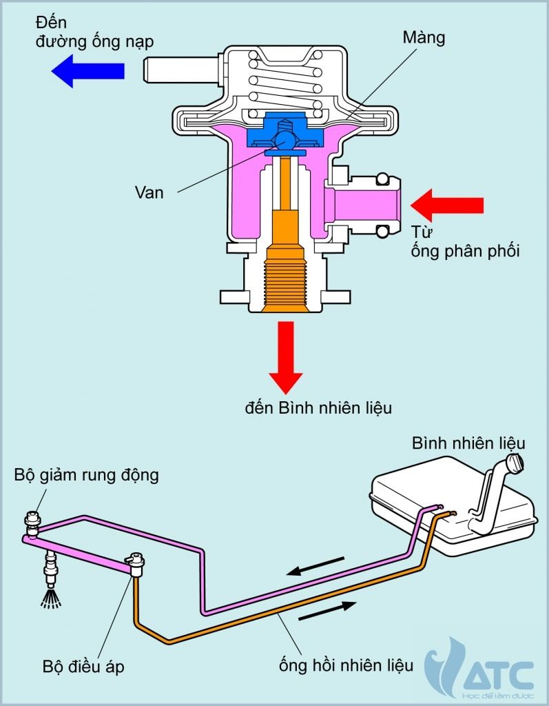 - Khi áp suất nhiên liệu vượt quá lực ép của lò xo trong bộ điều áp, van này mở ra để trả nhiên liệu trở về bình nhiên liệu và điều chỉnh áp suất.