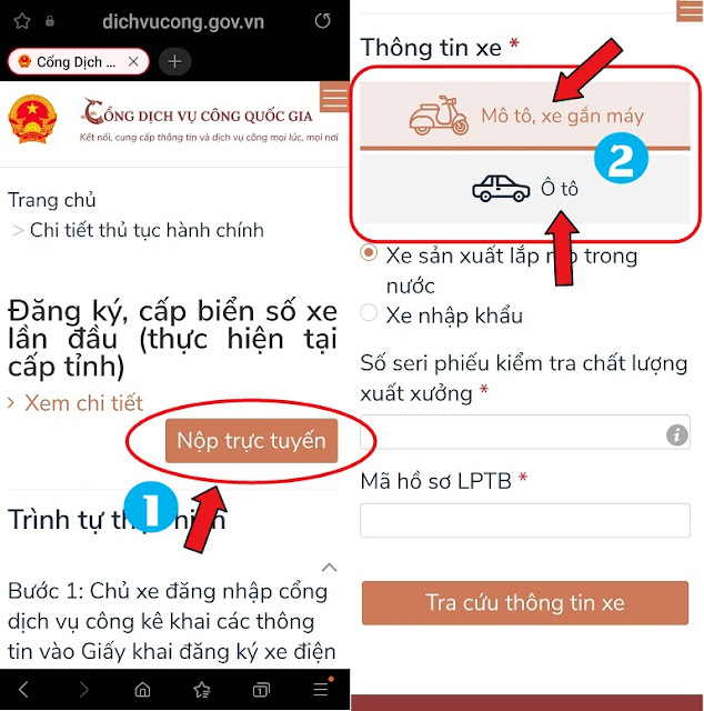 Tại giao điện tiếp theo, nhấn vào nút: Nộp trực tuyến, để đi đến trang tra cứu thông tin xe. Tại trang này, chọn loại xe cần kê khai đăng ký là mô tô, xe gắn máy hay là xe ô tô.