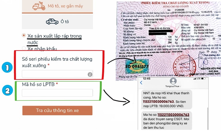 Nếu là xe sản xuất, lắp ráp trong nước, thì có 2 mục là Số seri phiếu kiểm tra chất lượng xuất xưởng, và Mã hồ sơ Lệ phí trước bạ.