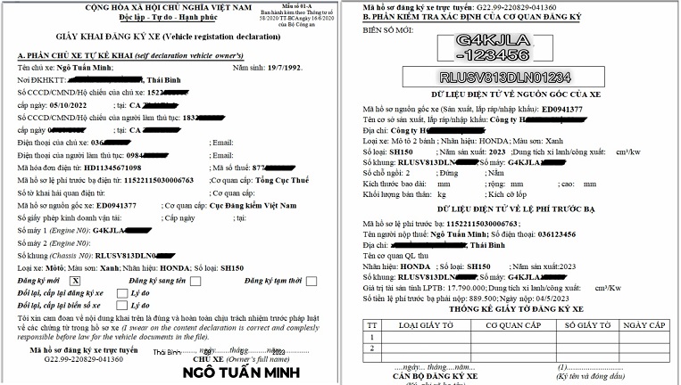 Sau khi kiểm tra hồ sơ xong, cán bộ tiếp nhận hồ sơ sẽ đưa một tờ khai đăng ký xe, với các thông tin đã kê khai và nộp trực tuyến ở bước số 4 được in sẵn, để chủ xe ký tên và ghi rõ họ tên vào tờ khai này để xác nhận. Sau đó, cán bộ tiếp nhận sẽ kiểm tra thực tế xe, dán bản chà số máy, số khung và hoàn thành thủ tục đăng ký xe theo quy định. -
