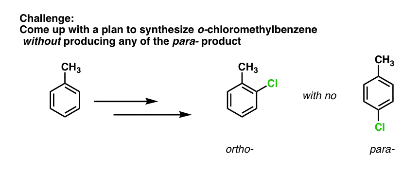 Well, this means that SO3H can be useful as a “blocking group” under some conditions. Again, we’ll have more to say on this when we get to synthetic strategy, but I’ll leave you with a challenge: how would you generate ortho-chloromethylbenzene from methylbenzene without any of the para- product?