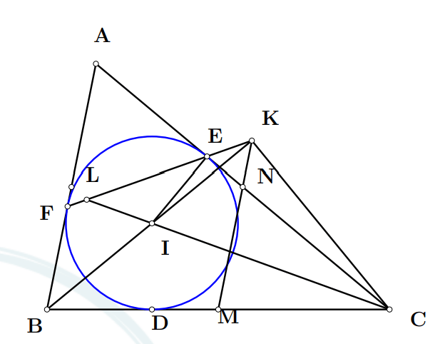 Tính chất 2. Cho tam giác $ABC$, đường tròn tâm $I$ nội tiếp tam giác $ABC$ tiếp xúc với $BC, AC, AB$ tại $D, E, F$. Gọi $M, N$ lần lượt là trung điểm $BC, AC$. Khi đó $EF, BI, MN$ đồng quy.