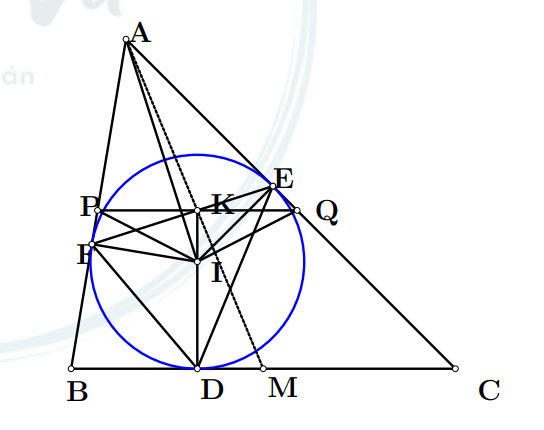 Ta có $angle I K perp P Q$, từ đó suy ra $I K P F, I K E Q$ nội tiếp, suy ra $angle I P K=angle I F K, angle I Q K=angle I E K$ mà $I E F$ cân tại $I$ nên $angle I E K=angle I F K$, suy ra $angle I P Q=angle I Q K$. Tam giác $I P Q$ cân nên $K$ là trung điểm $P Q$.