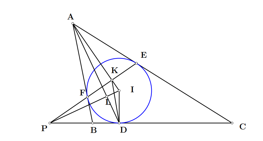Tính chất 4. Cho tam giác $A B C$, đường tròn tâm $I$ nội tiếp tam giác $A B C$ tiếp xúc với $B C, A C, A B$ lần lượt tại $D, E, F . E F$ cắt $B C$ tại $P$. Khi đó $frac{P B}{P C}=frac{D B}{D C}$ và $I P perp A D$.Chứng minh