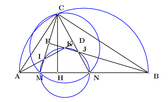 Bài 1. (PTNK 2014) Cho điểm $mathrm{C}$ thay đổi trên nửa đường tròn đường kính $A B=2 R$ $(C neq A, C neq B)$. Gọi $H$ là hình chiếu vuông góc của $C$ lên $A B ; I$ và $J$ lần lượt là tâm đường tròn nội tiếp các tam giác $A C H$ và $B C H$. Các đường thẳng $C I, C J$ cắt $A B$ tại $M, N$.(a) Chứng $operatorname{minh} A N=A C, B M=B C$.(b) Chứng minh 4 điểm $M, N, I, J$ cùng nằm trên một đường tròn và các đường thẳng $M J, N I$ và $C H$ dồng quy.(c) Tìm giá trị lớn nhất của $M N$ và giá trị lớn nhất của diện tích tam giác $C M N$ theo $mathrm{R}$.