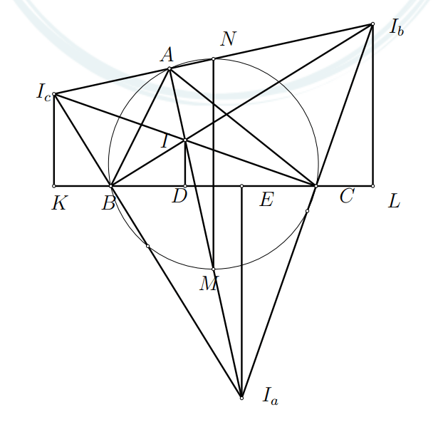Chứng minh tương tự thì $B D=p-b$ và $C D^{prime}=C E^{prime}=A E^{prime}-A C=p-b$, do đó $B D=C D^{prime}$.(b) Ta có $I K=I E, I_a D^{prime}=I_a E^{prime}$ nên $frac{I K}{I_a D^{prime}}=frac{I E}{I_a E^{prime}}$ và $I E / / I_a E^{prime}$ nên $frac{I E}{I_a E^{prime}}=frac{A I}{A I_a}$; do đó $frac{A I}{A I_a}=$ $frac{I K}{I_a D^{prime}}$, suy ra $triangle A I K backsim triangle A I_a D^{prime} Rightarrow angle I A K=angle I_a A D^{prime}$, từ đó $A, K, D^{prime}$ thẳng hàng.(c) Ta có $A I_b, A I_a$ là phân giác ngoài và phân giác trong góc $A$ nên $angle I_a A I_b=90^{circ}$ hay $I_a A perp I_b I_c$; chứng minh tương tự ta có $I_b B perp I_a I_c, I_c C perp I_a I_b$.
