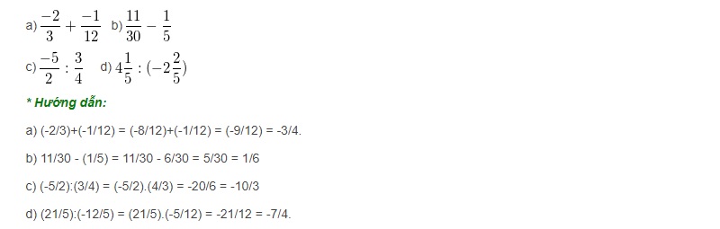 Phương pháp giải: Đầu tiên cần viết 2 số hữu tỉ đã cho dưới dạng phân số, rồi tiến hành áp dụng quy tắc tính toán để tính và đưa ra đáp số chính xác, cũng như rút gọn kết quả nếu có thể.