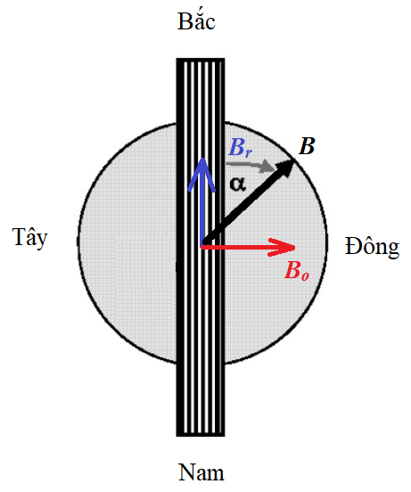 Từ trường tổng hợp (vec{B}=vec{B_r}+vec{B_0}) lập một góc (alpha) so với mặt phẳng cuộn dây. Ta biết được góc (alpha) này nhờ vào hướng chỉ mới của kim la bàn, bởi vì la bàn luôn hướng theo chiều vec-tơ từ trường tổng hợp. Giữa từ (vec{B_r}) và (vec{B_0}) có mối liên hệ lượng giác: