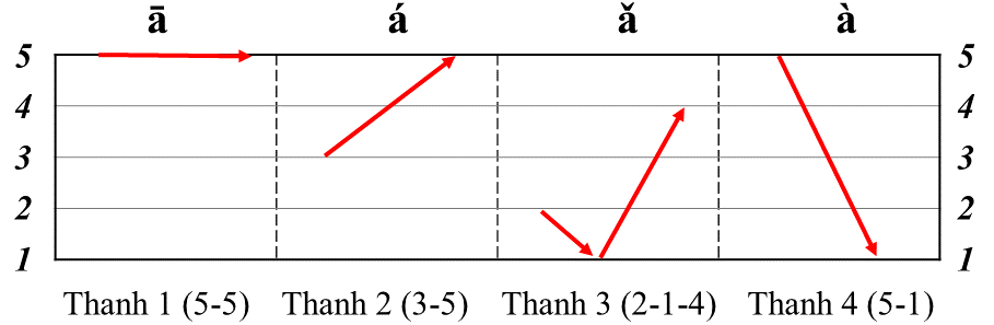 Thanh điệu Kí hiệu Độ cao Ví dụ Cách đọc Thanh 1 − 5-5 bā Đọc không dấu, kéo dài, đều đều. Thanh 2 / 3-5 bá Đọc như dấu sắc, đọc từ thấp lên cao. Thanh 3 V 2-1-4 bǎ Đọc như dấu hỏi, đọc từ cao độ trung bình – xuống thấp – rồi lên cao vừa. Thanh 4 5-1 bà Đọc không dấu, đẩy xuống, dứt khoát, đọc từ cao nhất xuống thấp nhất. Mẹo: Đọc thanh 4 bằng cách dùng tay chém từ trên xuống và giật giọng. Thanh nhẹ
